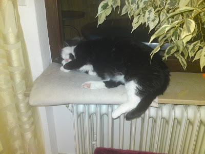 Klaaaaar, ich, Euer Jacky, auf seinem allerallerliebsten Heizungskuscheldeckenfensterplatz. Hier kann ich jetzt die bunten Lichter draußen am Balkon beobachten, wenn ich nicht gerade