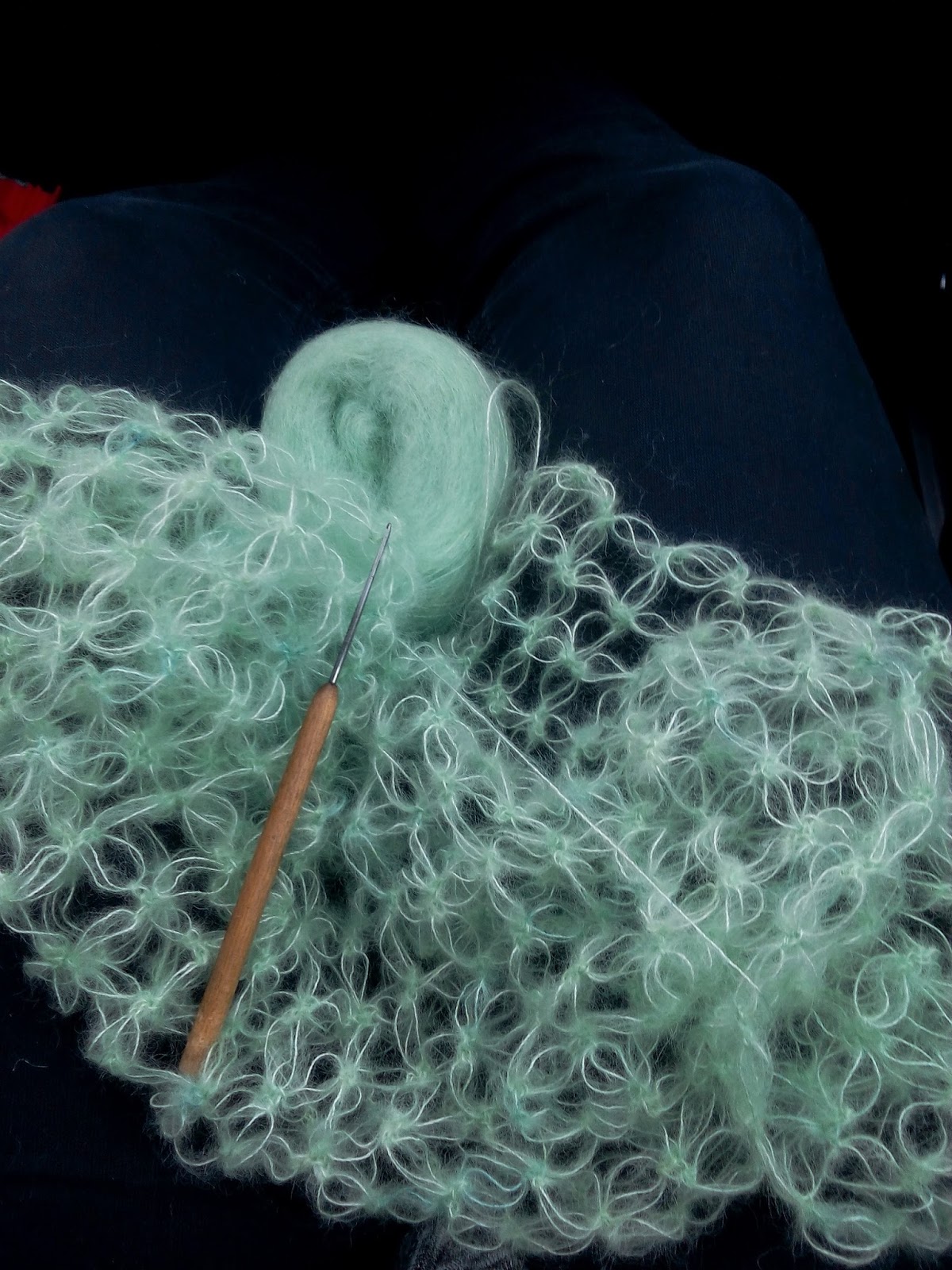 Das bestellte Liebesknotentuch für Frau Nachbarin (die es begeistert ihrer Tochter zeigte, diese wiederum es sich "einverleibt" hat und die Nachbarin nun wieder ohne da steht, weshalb... Ihr ahnt es schon - ein neues her muss) ist fertig geworden. Verwendet hat meine Petra diesmal kidsilk und Pailettengarn für den "bling-Effekt". Ich habe es anprobiert und denke, die Farbe würde mir sehr gut stehen.